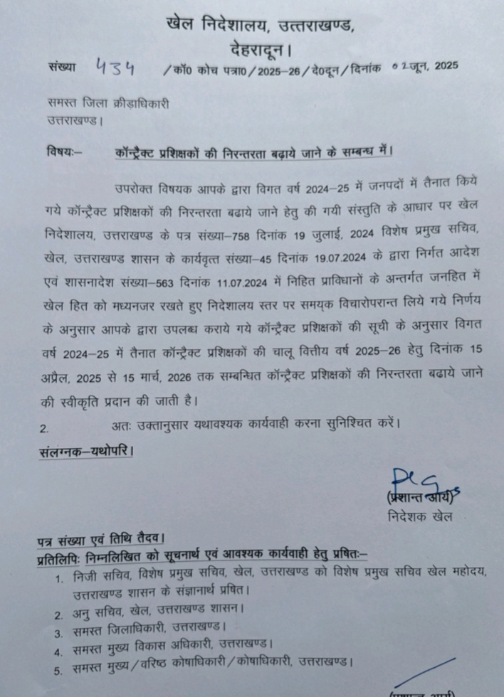 बीते सप्ताह खेल विभाग के अधिकारियों के साथ समीक्षा बैठक में इस पर खेल मंत्री रेखा आर्या ने कड़ी नाराजगी जताई थी और निदेशालय को इन सभी कॉन्ट्रैक्ट प्रशिक्षकों की सेवा की निरंतरता को बढ़ाने का निर्देश दिया था। इसके बाद मंगलवार को सभी जिला खेल अधिकारियों को पत्र लिखकर प्रशिक्षकों का कार्यकाल इस साल 15 अप्रैल से अगले साल 15 मार्च तक बढ़ाने का आदेश जारी कर दिया है।